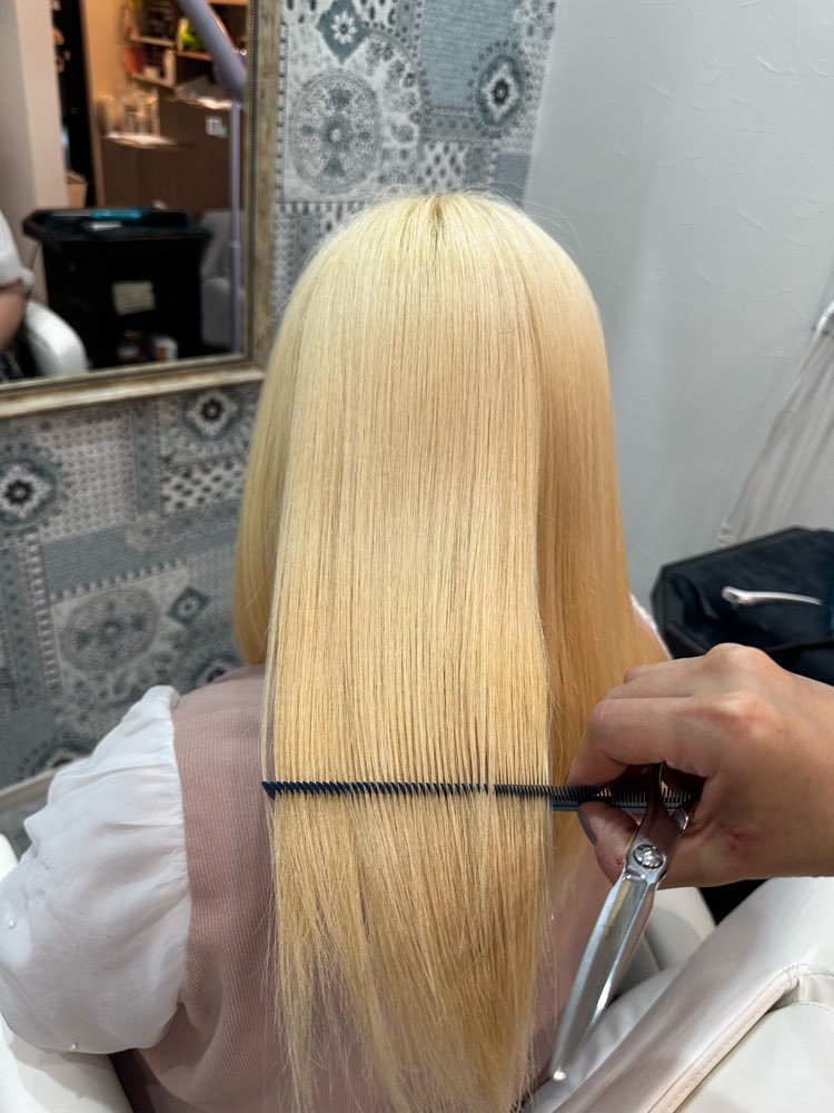 ブリーチと縮毛矯正の同時施術のため、切れ毛リスクは最高潮…!!